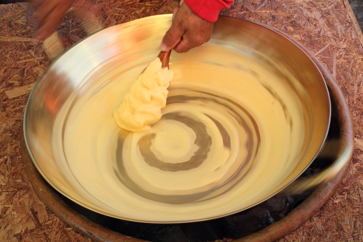 Le gars, il fait tourner la poêle sur un lit de glace et il y verse un liquide proche de la crème anglaise qui durcit progressivement avec le froid.